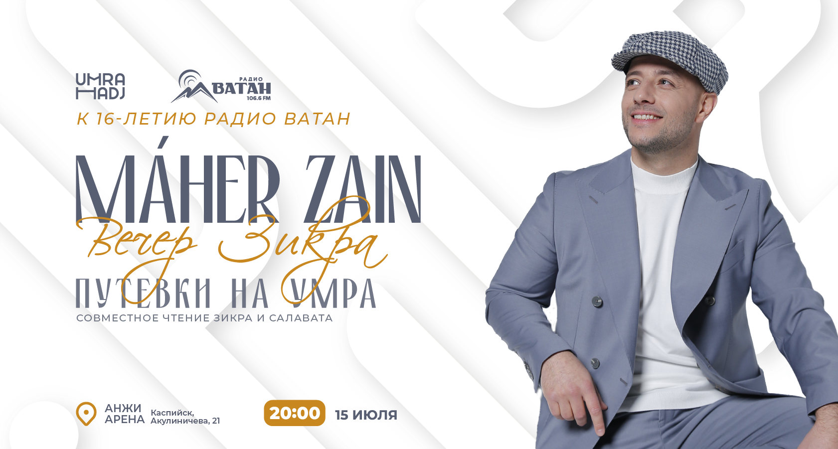 В честь 16 летия радиостанции «Ватан» большой вечер нашидов с участием мировой звезды - Махер Зейн в Махачкале! Вас ждут розыгрыши путевок на умра-хадж, совместное чтение зикра и салавата, нашиды от популярных исполнителей России: Нашидуль ислам и другие.